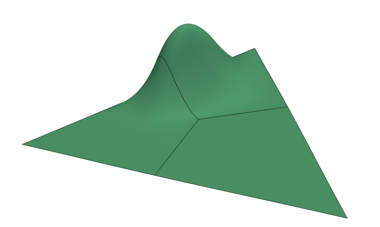 Another thing I worked on with another graduate student was coming up with a simple example demonstrating the difference between a traditional B-Spline and a U-Spline — in 2-D. Remember that a traditional B-Spline is a basis-spline constructed via the Cox de Boor recursion algorithm in 1-D and then expanding to higher-dimensions via tensor products. The figure below shows an unstructured spline topology and demonstrates a quadratic spline basis function with maximal continuity, B-Splines on the left and U-Splines on the right. Notice that the B-Spline basis is and has to be constructed via three carefully parameterized B-Spline tensor product surfaces. In practice (i.e. moden CAD) this basis wouldn’t even be continuous, but rather